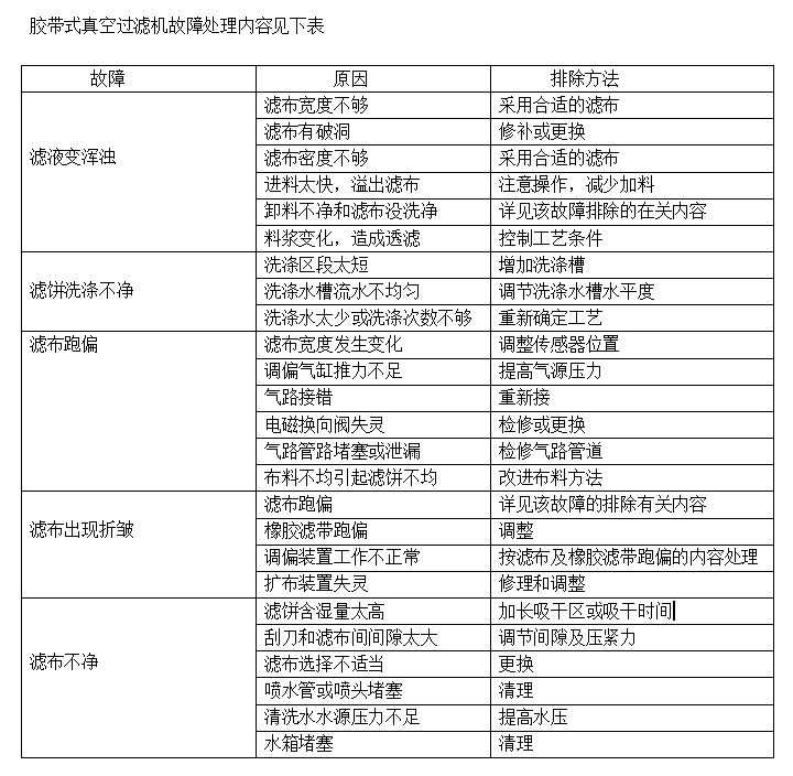 帶式真空過濾機以濾布為過濾介質,采用真空箱作為真空室。由傳動裝置做連續運行。料漿由分布器均布在濾布上,當真空室接通真空系統時形成母液抽濾區、濾餅洗滌區和濾餅抽干區,,濾液穿過濾布進入真空室,固體顆料截留在濾布上形成濾餅。進入真空室的濾液經自動排液罐排出,固體濾餅由刮刀卸除。卸除濾餅的濾布經清洗后獲得再生并重新進入過濾區。